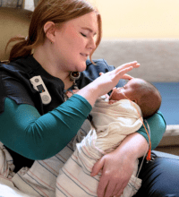 Erb can sing to infants as young as 28 weeks, though she doesn’t hold them or introduce light-touch techniques until about 32 weeks, since they’re still developing their senses during that time. Her role in the NICU becomes especially important when parents are unable to be at the infant’s bedside for a long period of time.